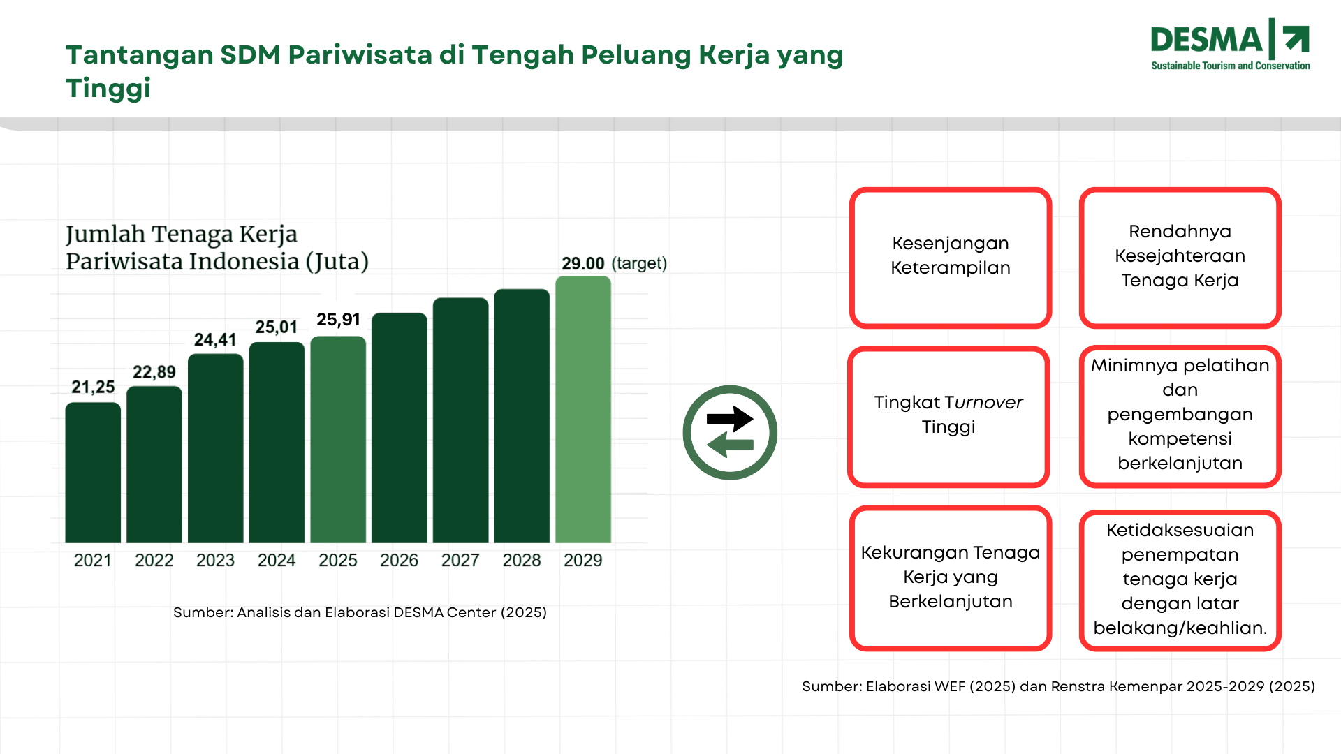 Menurut World Economic Forum (2025), meskipun mampu menciptakan peluang kerja yang besar, sektor perjalanan dan pariwisata masih menghadapi tingkat turnover yang tinggi, kesenjangan keterampilan yang mengancam pertumbuhan dan kualitas layanan, serta kekurangan tenaga kerja yang persisten (bahkan bertahun-tahun setelah pemulihan pascapandemi). Lebih lanjut, Kementerian Pariwisata (2025) mengidentifikasi tantangan SDM pariwisata meliputi rendahnya kesejahteraan pekerja, kurangnya pelatihan berkelanjutan, dan penempatan tenaga kerja yang tidak sesuai dengan latar belakang dan keahliannya.