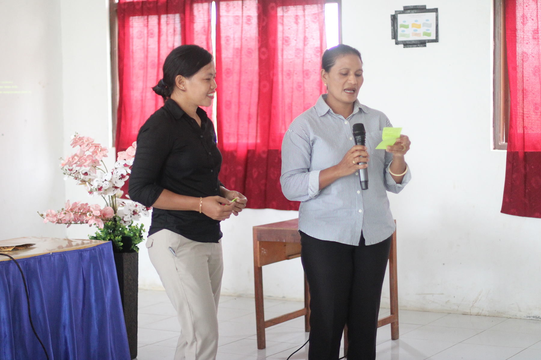 Sesi pertama dipandu oleh Bapak Adrianus Ubas, Programme Officer Field Office Sumba DESMA Center dengan diskusi kasus kekerasan yang pernah mereka temui serta solusi yang dapat dilakukan. Sesi kedua dipandu oleh Ibu Agustina Purnami Setiawi, Programme Officer Field Office Sumba DESMA Center yang membahas jenis-jenis perundungan seperti kekerasan verbal, fisik, psikologis,perundungan dunia maya (cyberbullying), serta dampaknya terhadap siswa.