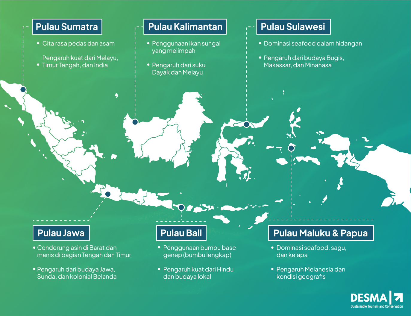 Gastronomi Indonesia adalah refleksi dari keanekaragaman budaya, sejarah, dan kondisi geografis yang membentuk identitas kuliner di setiap wilayah. Sumatra kaya akan cita rasa pedas dan asam dengan pengaruh Melayu, India, dan Timur Tengah, sementara Maluku dan Papua memanfaatkan hasil laut, sagu, dan kelapa sesuai dengan ekologi maritimnya. Jawa menawarkan kompleksitas rasa dari asin hingga manis, mencerminkan perpaduan budaya lokal dan kolonial. Kalimantan mengandalkan ikan sungai dan tradisi Dayak-Melayu, sementara Sulawesi menonjol dengan seafood khas Bugis, Makassar, dan Minahasa. Bali, dengan bumbu base genep, mempertahankan filosofi kuliner berbasis Hindu. Kombinasi faktor geografis dan budaya ini menjadikan Indonesia sebagai salah satu warisan kuliner terkaya di dunia.