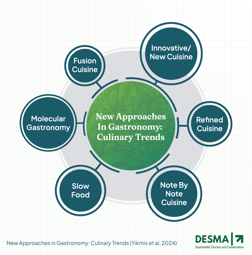 Tren Experiential Experience selaras dengan tren kuliner dalam pendekatan baru gastronomi menurut Yikmis et al (2024), yang keduanya berorientasi pada penciptaan pengalaman unik dan inovatif pada konsumen. Enam tren gastronomi—Fusion Cuisine, Molecular Gastronomy, Slow Food, Nouvelle Cuisine, Refined Cuisine, dan Note by Note Cuisine—berpotensi diimplementasikan di Indonesia melalui inovasi rasa berbasis kearifan lokal, teknologi kuliner berbasis sains, penguatan ekosistem pangan berkelanjutan, peningkatan standar fine dining, serta eksplorasi bahan sintetis untuk efisiensi industri pangan.